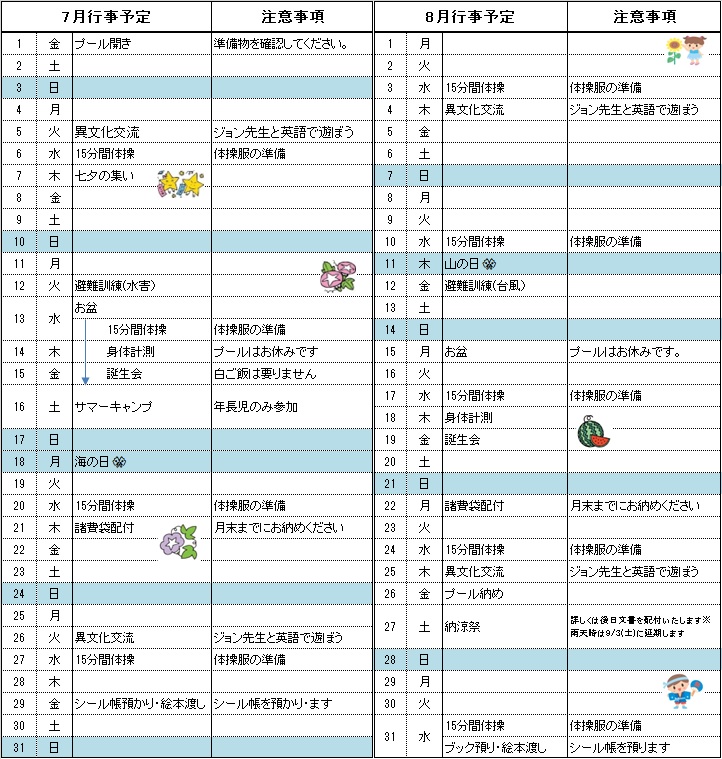 明照保育園 7月・8月の行事予定 2022.07.08 お知らせ●お願い ◆プール遊び、水遊びが始まりました。毎日の健康確認とチェック表への記入をお願いいたします。 ※チェック票への記入がない場合、プール遊び・水遊びの活動に参加することができません。 ◆水曜日・土曜日・お盆期間はプールはお休みです。 ・天候や各クラスの活動計画、子どもたちの健康状況に合わせて、活動内容に変更が あることもあります。ご理解とご協力をお願いいたします。 保護中: プール開きをしました🍉 前の記事 活動報告(原口こども園):☆プール開きをしました☆ 次の記事