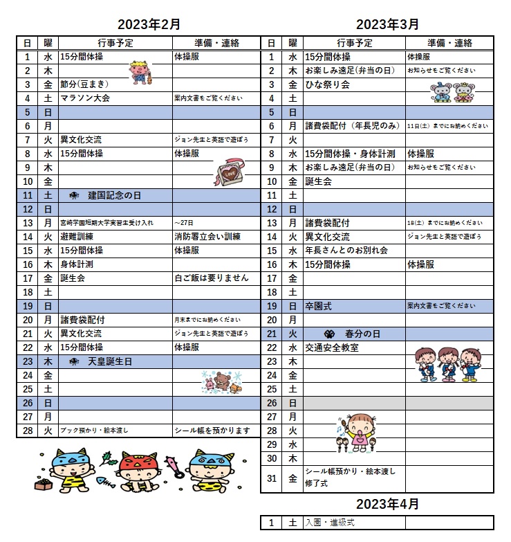 明照保育園 2月・3月行事予定 2023.02.07 【お楽しみ遠足(弁当の日)で動物園に行きます】 3月2日(木) すみれ組・たんぽぽ組・ひまわり組(5歳児) 3月9日(木) ちゅうりっぷ組・ひまわり組(4歳児)ひまわり組(5歳児) ※ひまわり組5歳児は、2日・9日ともにお弁当が必要です。 詳しい内容はクラスだよりでお知らせいたします。 明照保育園 1月・2月行事予定 前の記事 保護中: 卒園式がありました🌸 次の記事